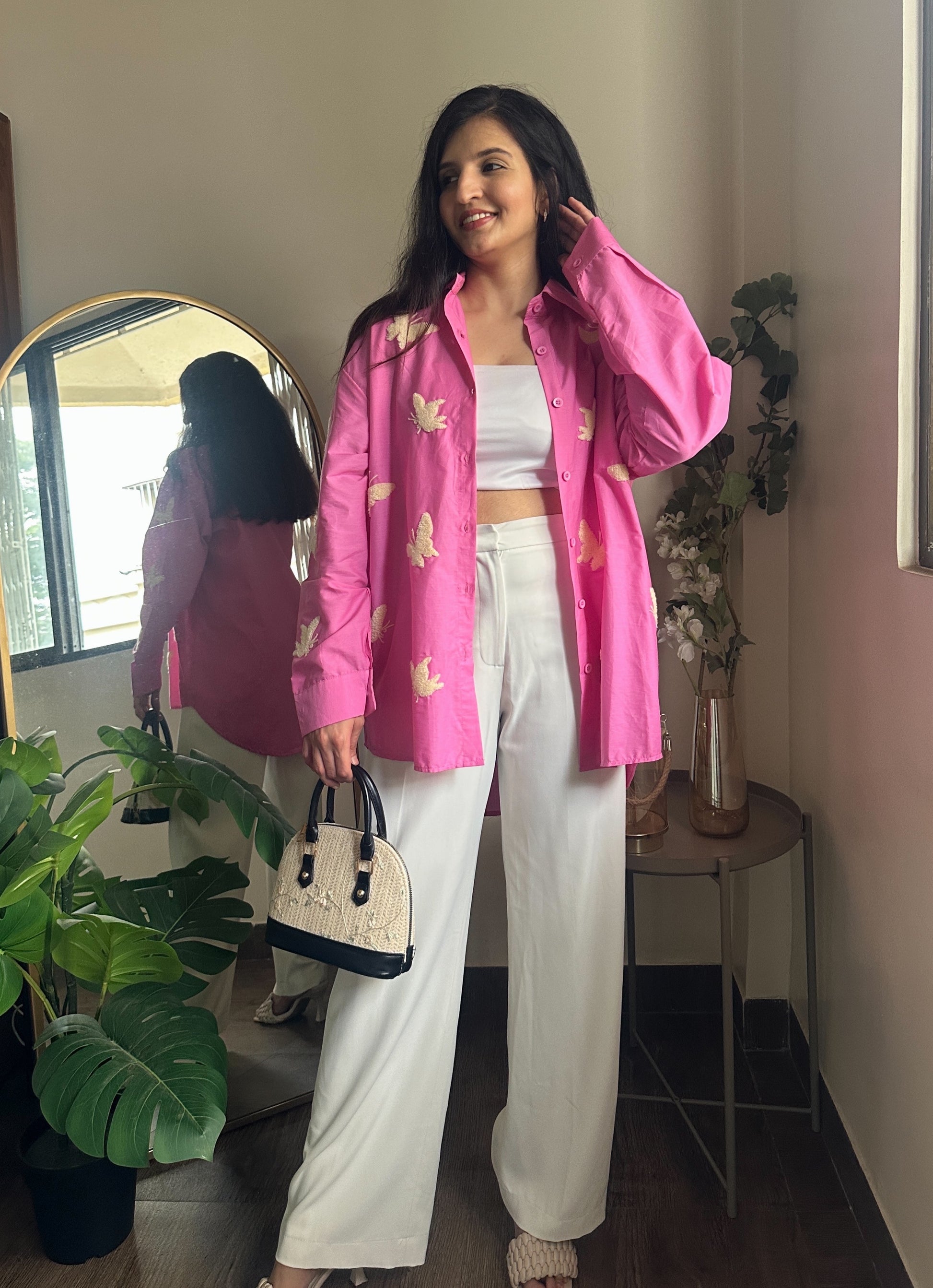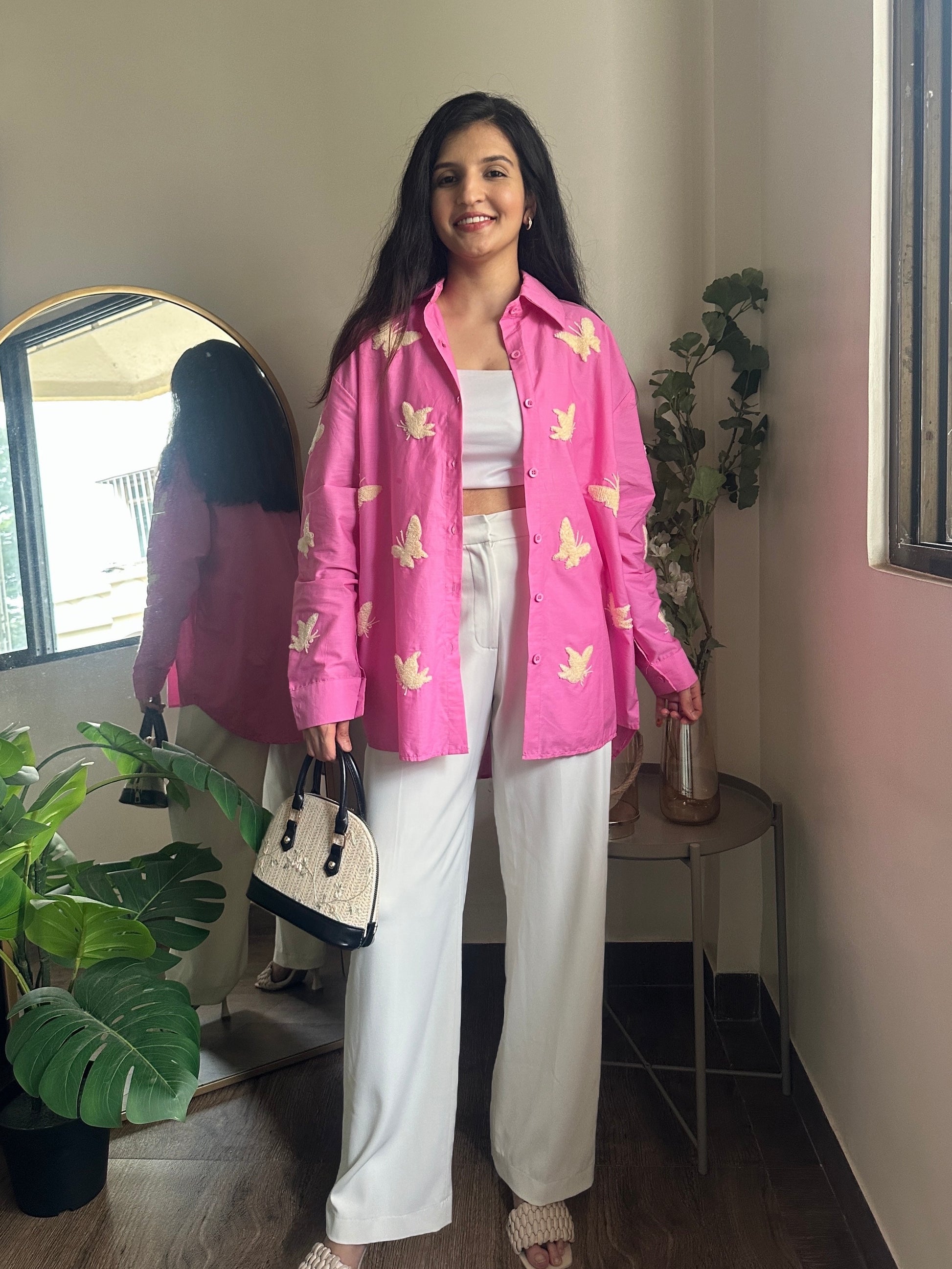 A Pink shirt scattered with pink embroidered butterflies— whimsical, cute, and just the right amount of drama for holiday nights.